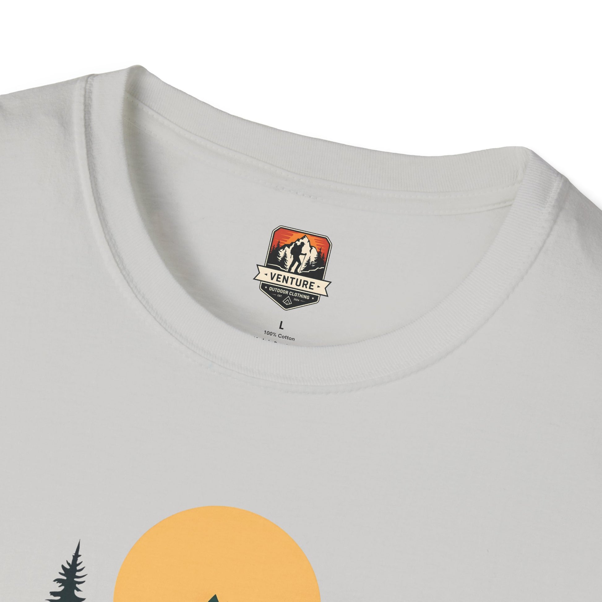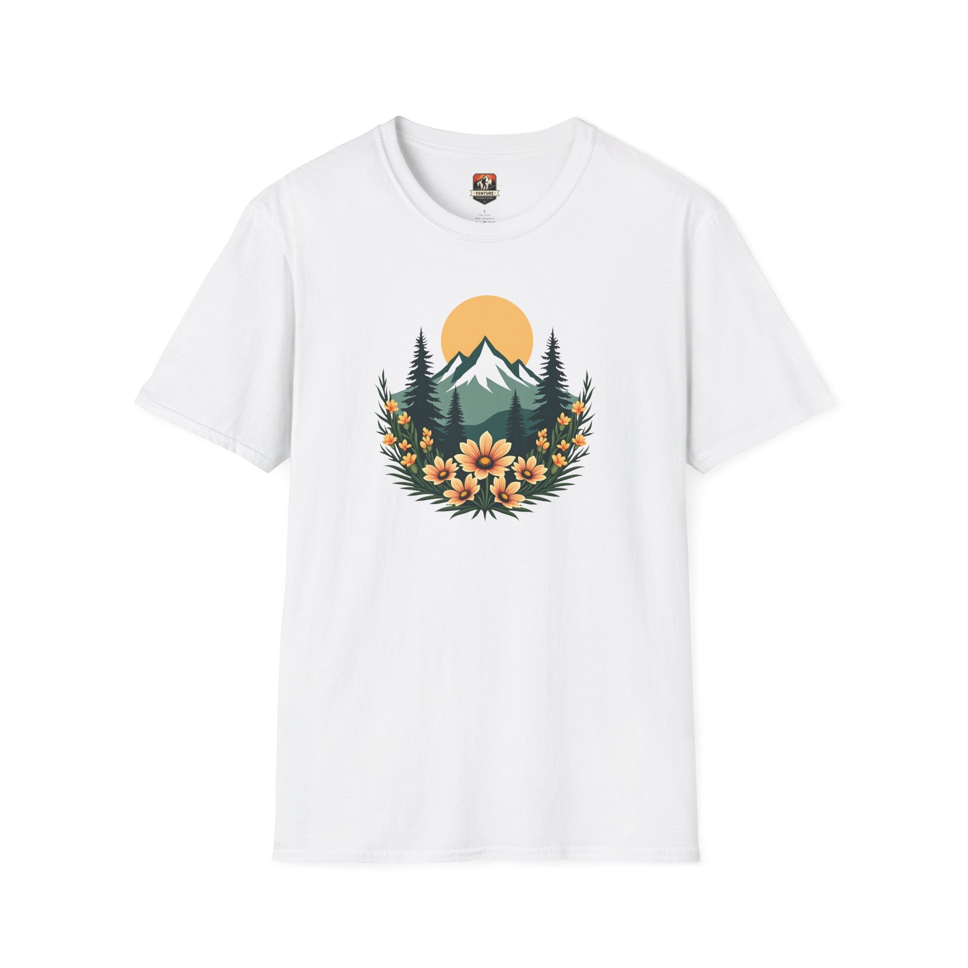 The mountain's gentle embrace. The Mountain Bloom tee captures the beauty of wildflowers blooming at the foot of towering mountains, a testament to nature's resilience and beauty.